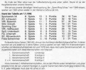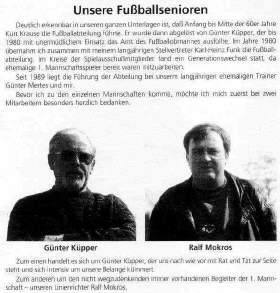 Erinnert Euch an die Zeiten unseres langjährigen Jugendwartes Gerd Töllner genannt Joni". Toni hat alles gemacht, schließlich noch den Schiri-Schein und dann wurde er noch Kreisstaffelleiter. Für diese außergewöhnlichen Leistungen wurde Toni mit der goldenen Vereinsnadel geehrt. Über viele Jahre stand Toni unser Karlheinz Müller zur Seite. Karlheinz war mit der besonderen Gabe ausgerüstet, die Kinder sportlich an sich zu binden, wodurch unsere Jugendabteilung enorrnen Auftrieb erhielt. Heute ist Karlheinz immer noch erfolgreicher Jugendtrainer bei Fortuna 95.